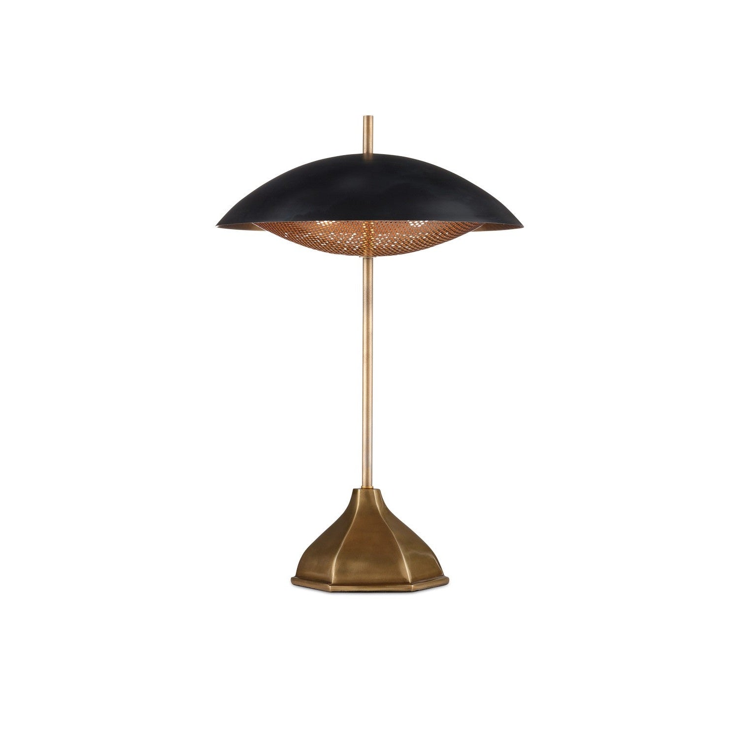 With its seriously handsome profile, the Domville Table Lamp is made of aluminum in an antique brass finish, capped off with a black metal shade. Tom Caldwell designed this lamp with its hexagonal hand-formed base and punched-metal diffuser that will add a hint of texture as light wafts through it. A design detail of note is how the finial projects up through the domed shade as if it continues from the lamp's thin body.